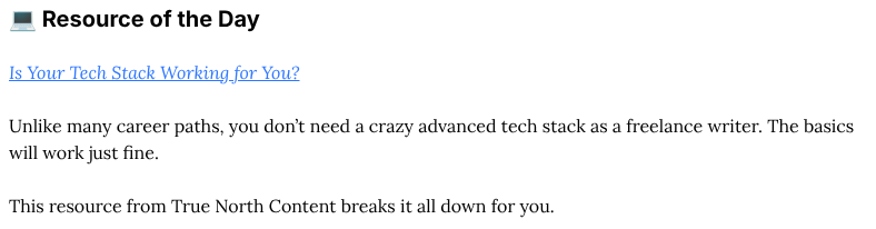 I was a fan of his first newsletter featuring freelance writing jobs that he recently sold, so I hopped on signing up for Freelance Five as soon as he hit send. His promise of five good resources comes true, and I love the brief approach. He featured my tech stack audit framework in Ed. 004!
